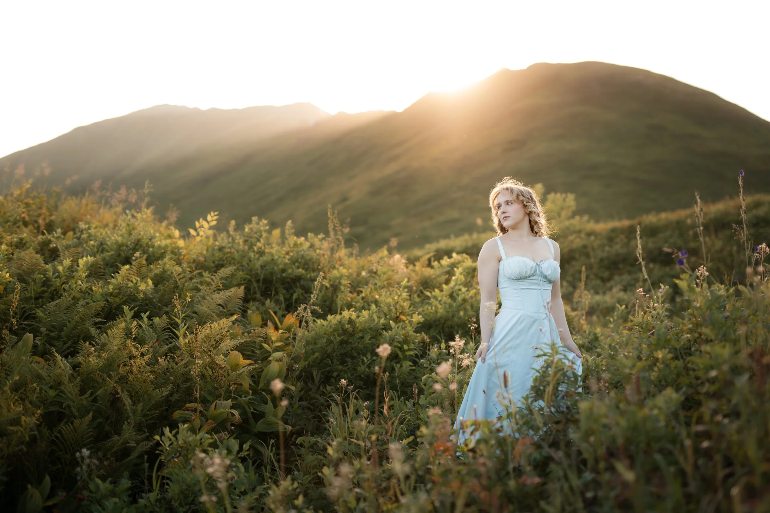 We met up just as the sun began to dip behind the peaks, painting the tundra in rich golds and pinks. The wind was soft, the air crisp , that perfect late summer evening that feels like it was made for portraits. My senior client showed up looking stunning! She chose this gorgeous dress that allowed her to stand out from the folliage but relfected the blue of the mountains.